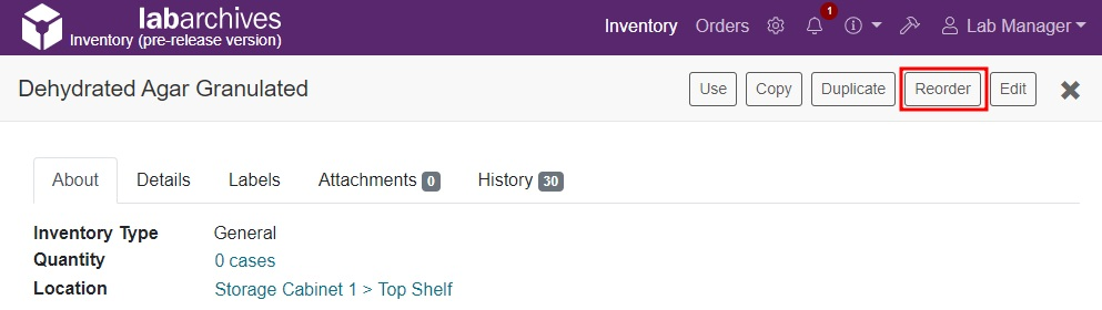 When a vendor-supplied inventory item is running low or is depleted, users can make a reorder request. There are two ways to reorder items from LabArchives Inventory.