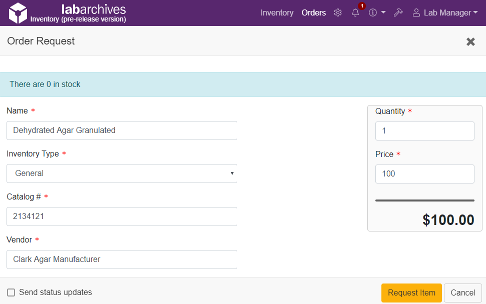 To complete the Order request, click “Request Item” and the request will be listed on the Orders tab and a notification will be sent to the Lab Manager(s).
