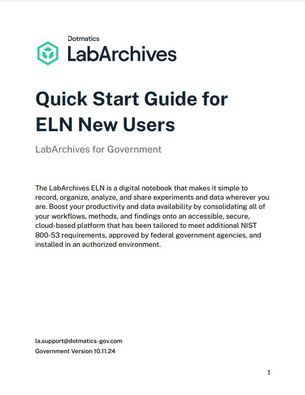 Quick Start Guide for ELN New Users April 14, 2025 14:56 Updated Download link available at the end of the article. Download your own copy of Quick Start Guide For New Users: Gov_LabArchives_QSG_New_Users_10.11.24.pdf 600 KB Download
