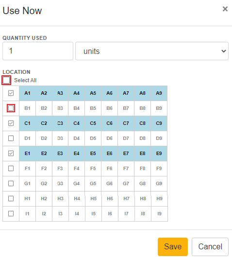 Click on the “Use Now” button. Enter the quantity you are using and click on the freezer box cell to indicate the impacted cell that is being used.