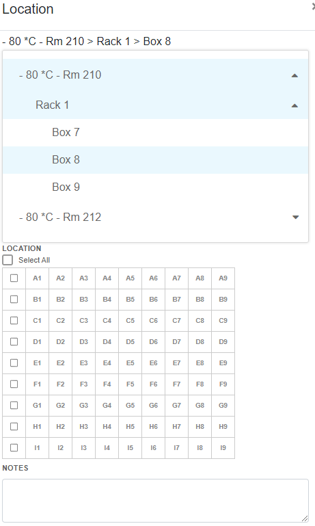 Before adding the aliquot, be sure that the storage location has already been set up to reflect the exact size of the freezer box (e.g., 9 x 9). See Add an Inventory item for more information.