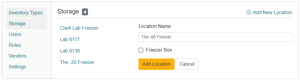 Note: We recommend setting up the storage locations before adding items to your inventory. The Import Template allows you to specify the location of each items using top-level locations, bottom-level locations, and if applicable, the freezer box cells. This information can only be imported if the locations are specified in Inventory first. Click here to learn more about using the Import Template.