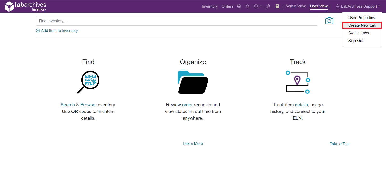 You will then be redirected to your new Inventory lab, where you can start importing users and inventory. To switch back to your original lab, click on your name in the menu bar and select “Switch Labs”.