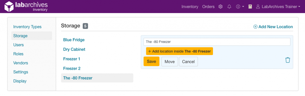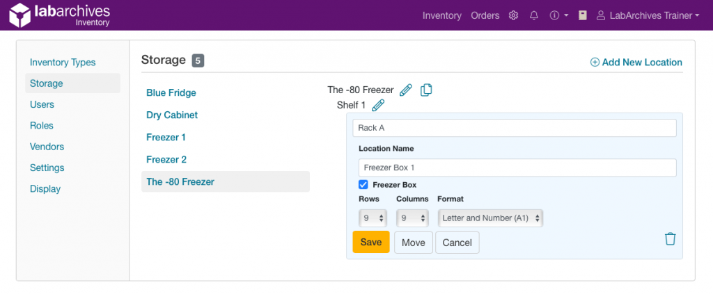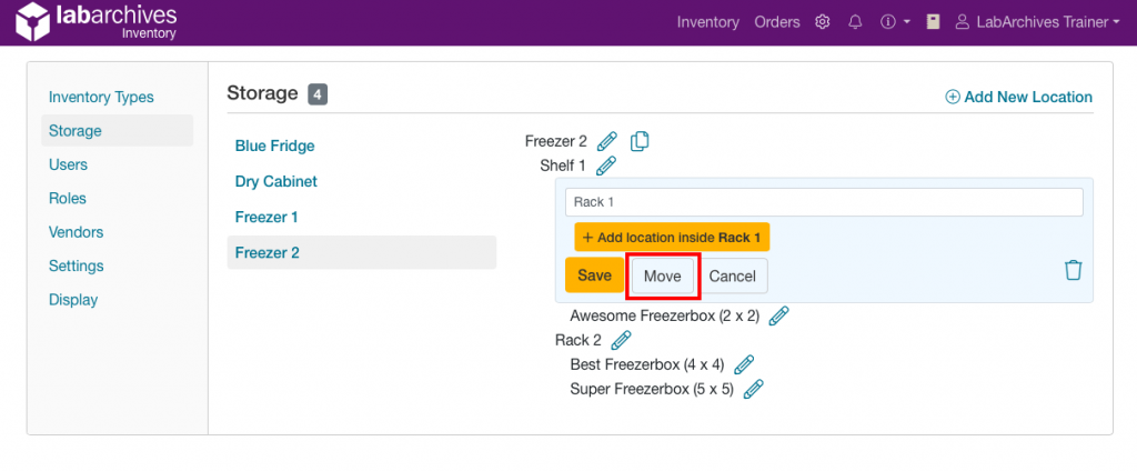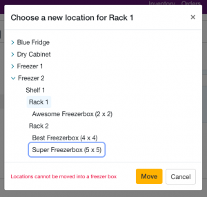 Lab Managers can move a group of items to another storage location. This is an easy way to update the location for multiple items at once. For example: an entire freezer rack in your lab is moved from one freezer to a different freezer. You can use our move storage feature to move this entire rack (including all sublocations, such as freezer boxes) in your inventory. Saving the time to update each inventory item’s location one by one.
