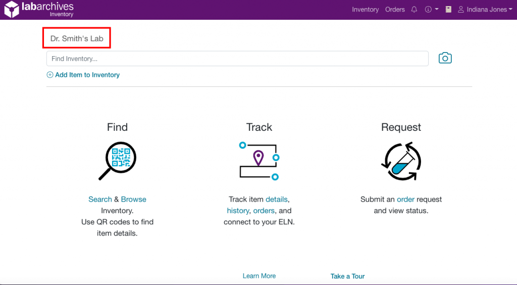 The name of the current lab you are in will show on both the landing page and the Inventory screen. This ensures users who are part of multiple Inventory labs know which lab they are currently viewing.