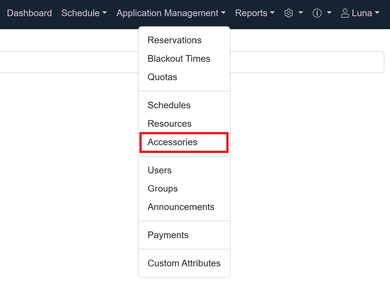 Application Administrators can access the Accessories page from the Application Management menu.