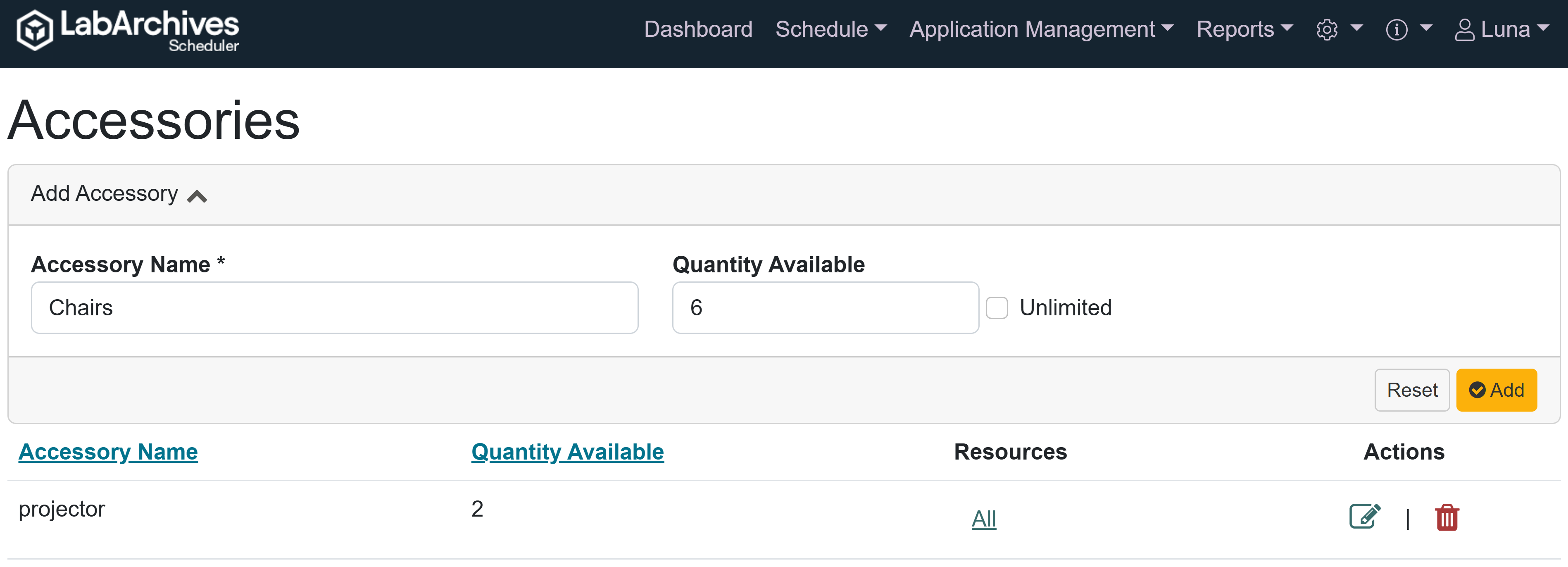 Labs may frequently use disposable or reusable items that don’t fit the standard definition of a resource in LabArchives Scheduler and therefore don’t warrant the creation of a Resource in Scheduler. These items can be managed in Scheduler by creating Accessories. Accessories are tied directly to a specific Resource and are available for booking from the Resources Reservation page.