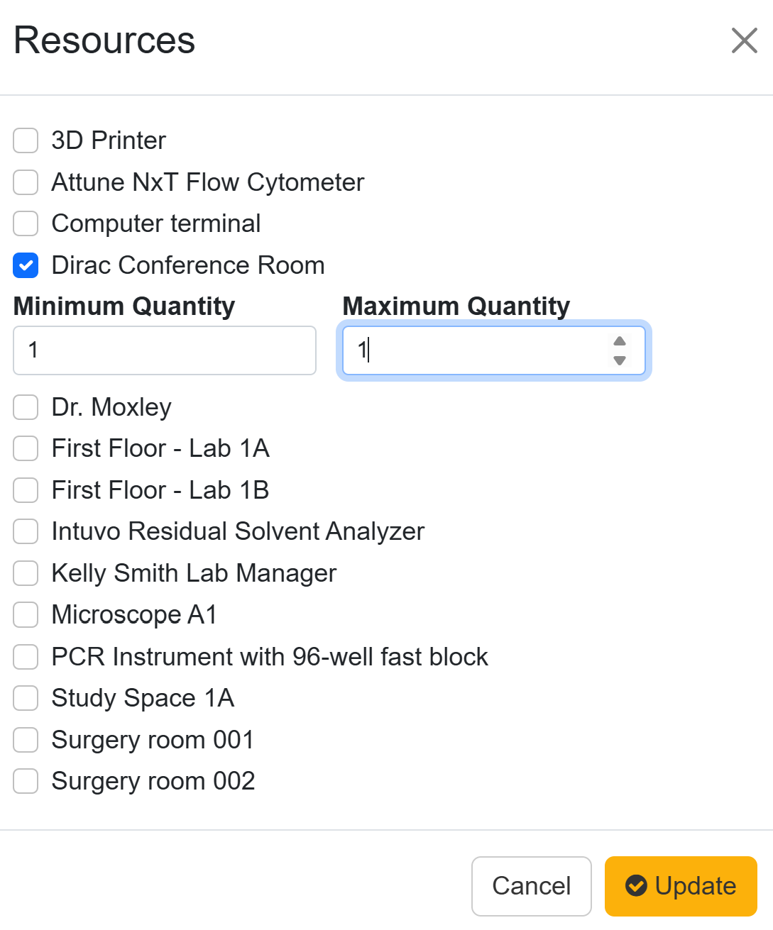 After the Accessory is saved, visit the Resources column and click the All link to tie the accessory to the booking of a specific Resource. For example, if you want to allow your users to also reserve a projector when booking a conference room, select the conference room from the Resources list and select the minimum and maximum number of projectors available.