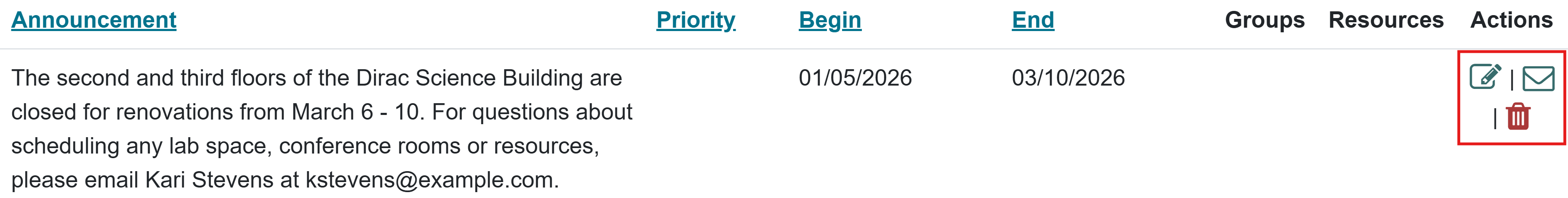 Existing Announcements can be edited via the pencil icon, deleted with the trash can icon, or sent via mail icon.