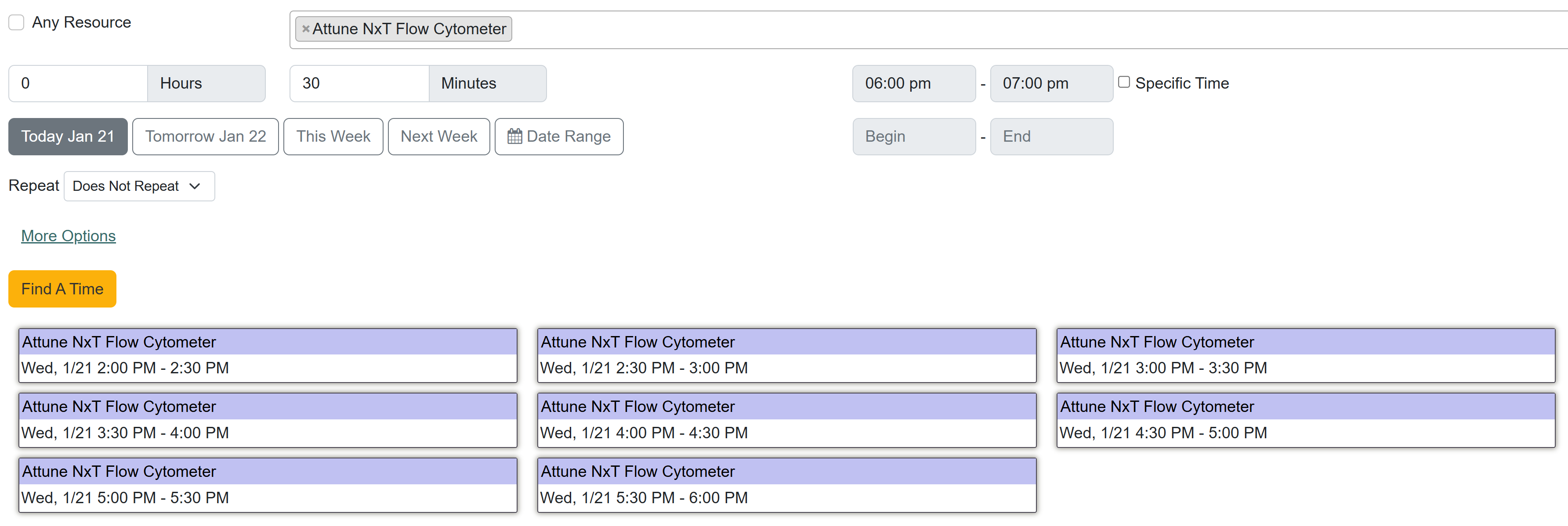 After setting your criteria, click Find a Time to view matching availability. Select any result to proceed with creating a reservation.