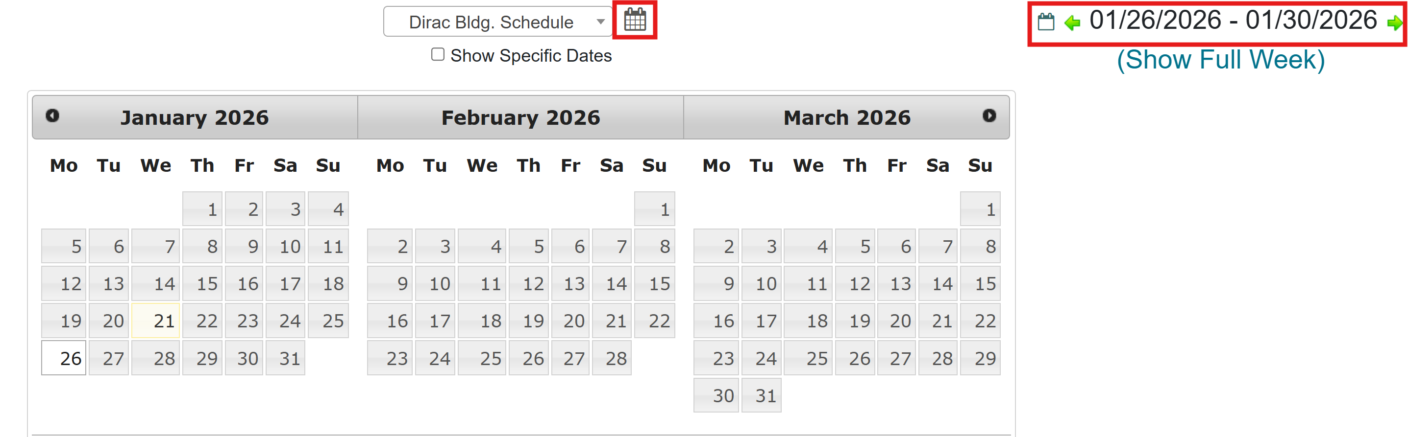 You can change the displayed month by clicking the calendar icon at the top of the screen. To move between weeks, use the arrow buttons on the right-hand side.